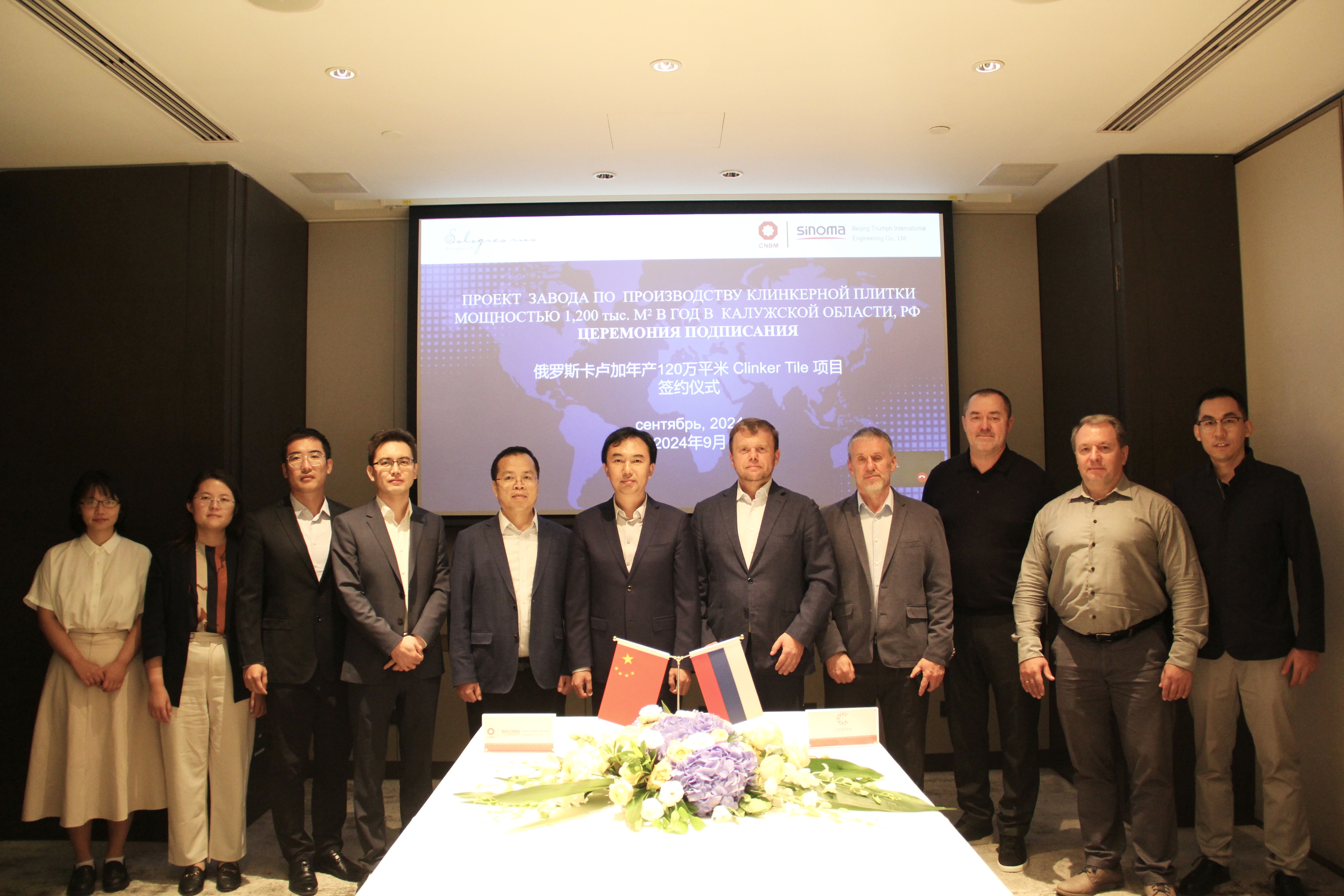 Tochka Center集團項目總監Sergei Shumilin,Sologres公司董事Maksim Baidakov,北京凱盛總經理謝吉優、副總經理曹玉波、水泥項目設計經理王巖、陶板項目設計經理馬雷、市場經理李梓冰、商務專員黎瑞祺,北京凱盛俄羅斯公司高級顧問Maxim Stroganov參加簽約儀式。